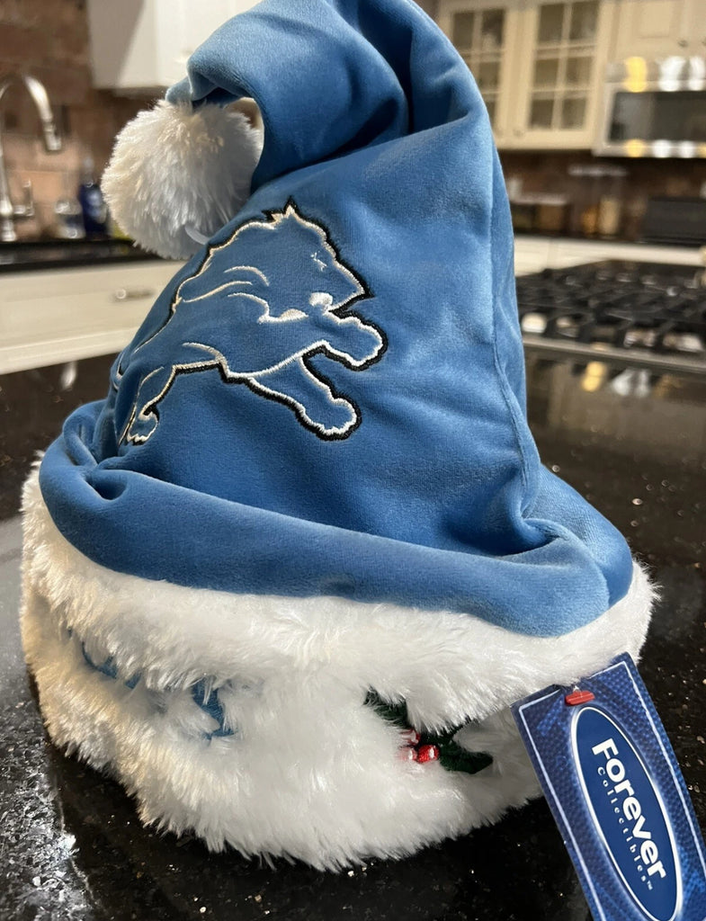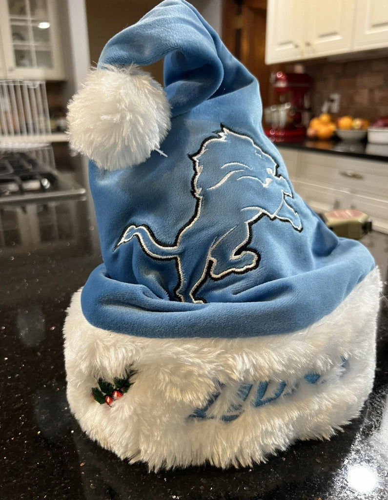 Detroit Lions NFL big logo plush Solid Blue santa hat for adults. Perfect for fans of the National Football League (NFL)