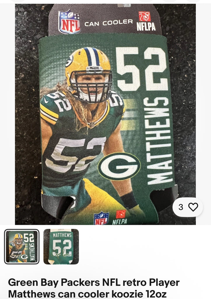 Green Bay Packers NFL retro player Clay Matthews can cooler koozie. The koozie can hold up to 12 oz can and features the WinCraft