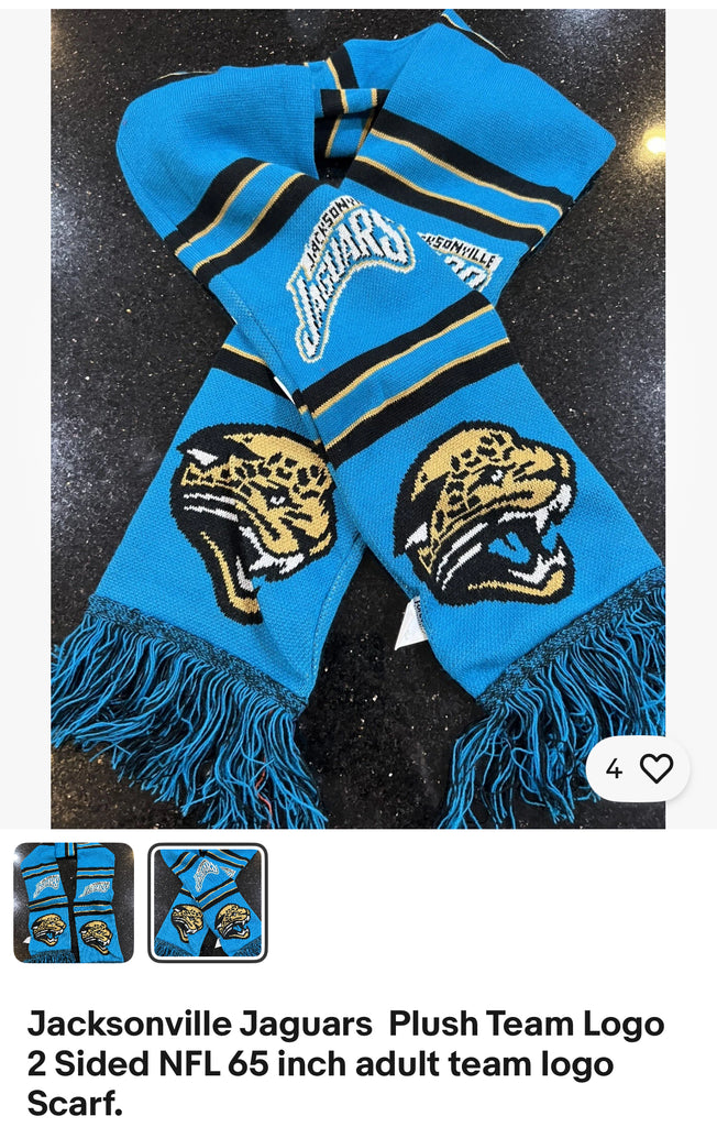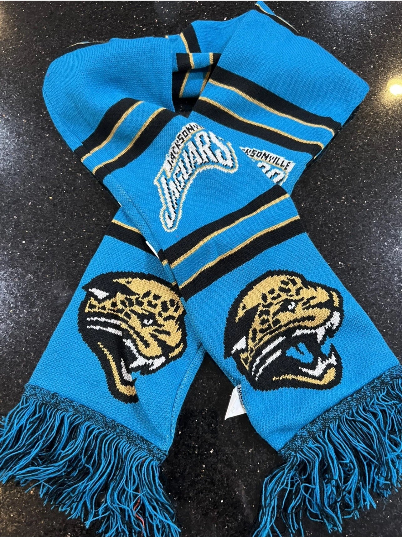 Jacksonville Jaguars 65-inch adult team logo scarf. This two-sided plush scarf features the team's logo on both sides, making it the perfect accessory for any fan