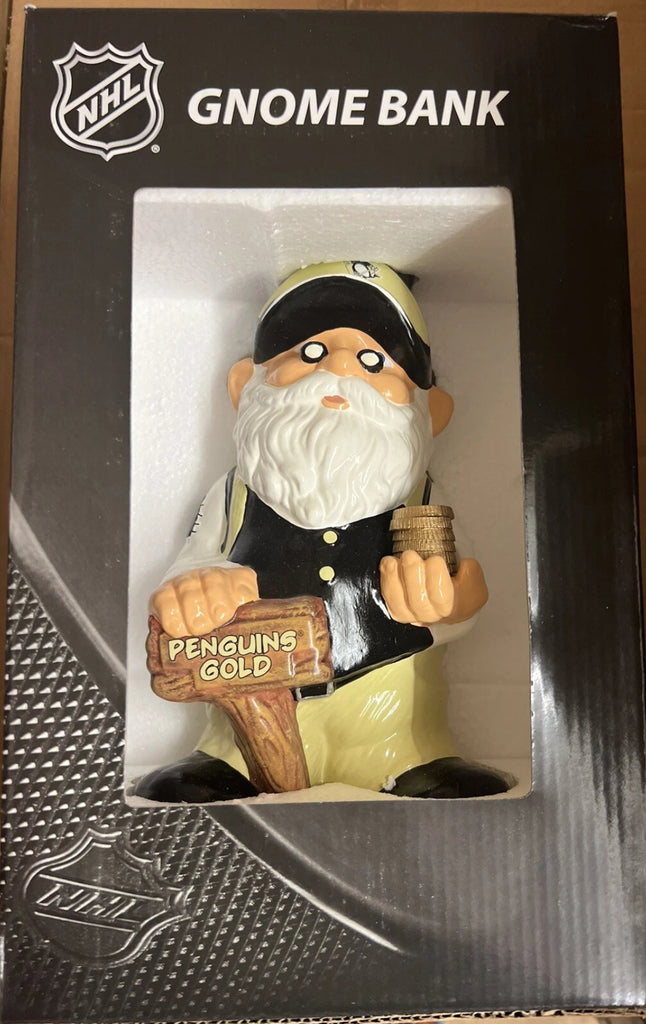 Bring home the fun and spirit of the Pittsburgh Penguins with this 10-inch coin bank garden gnome. Featuring the iconic team mascot, this yard figure is perfect for any fan of the National Hockey League (NHL). Made by Forever Collectibles, this high-quality product is a must-have for any baseball or hockey enthusiast.